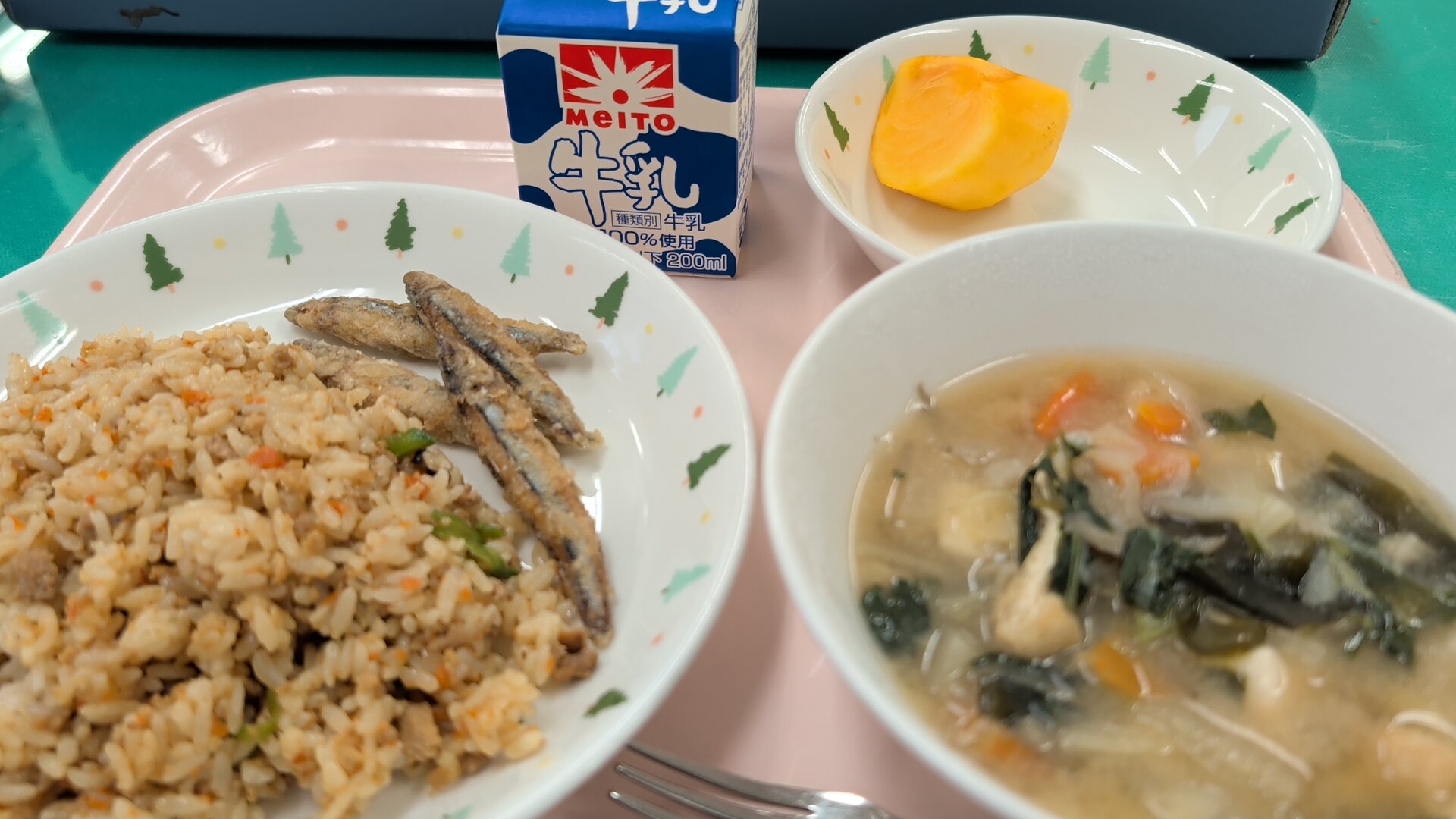 今日の給食は、凍り豆腐ごはん・きびなごのから揚げ・具だくさんみそ汁・柿・牛乳でした。