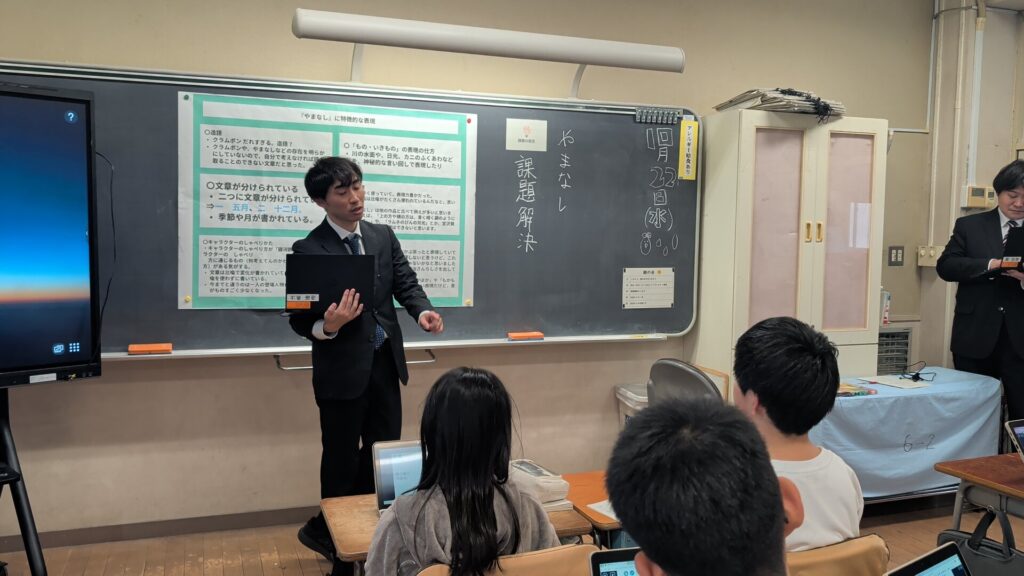 子供たちは、本文を何度も読み返したり、友達と意見を交わしたり、チャットを使って自分の考えを発信したりしながら、問いを解決しようと夢中になって学んでいました。