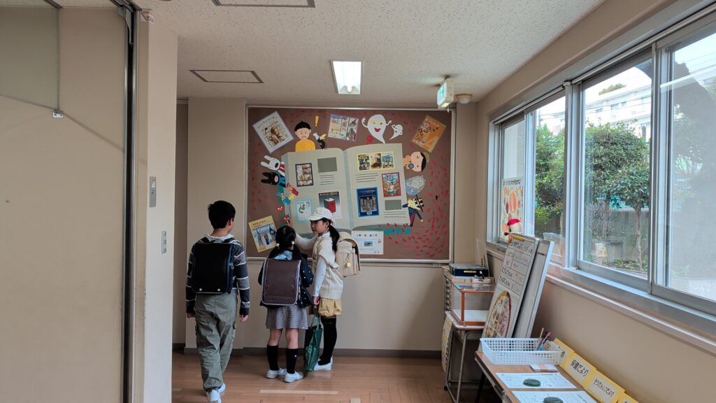 子供たちは登校するとすぐに掲示の前に集まり、新しい本を見つけては「これ知ってる!」「読んでみたい!」と目を輝かせていました。