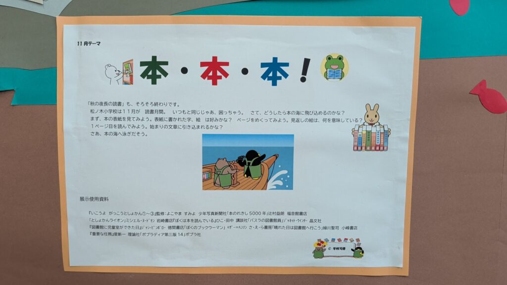 学校全体図書ボランティアの皆様が、11月の大型掲示を作成してくださいました。