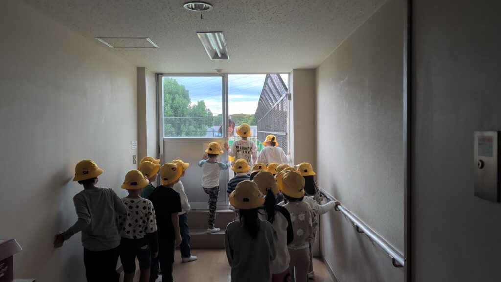 学校全体1年生は国語の学習「くじらぐも」の延長で、屋上に出て雲の観察をしました。