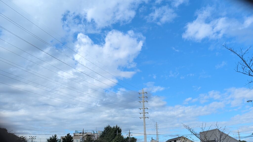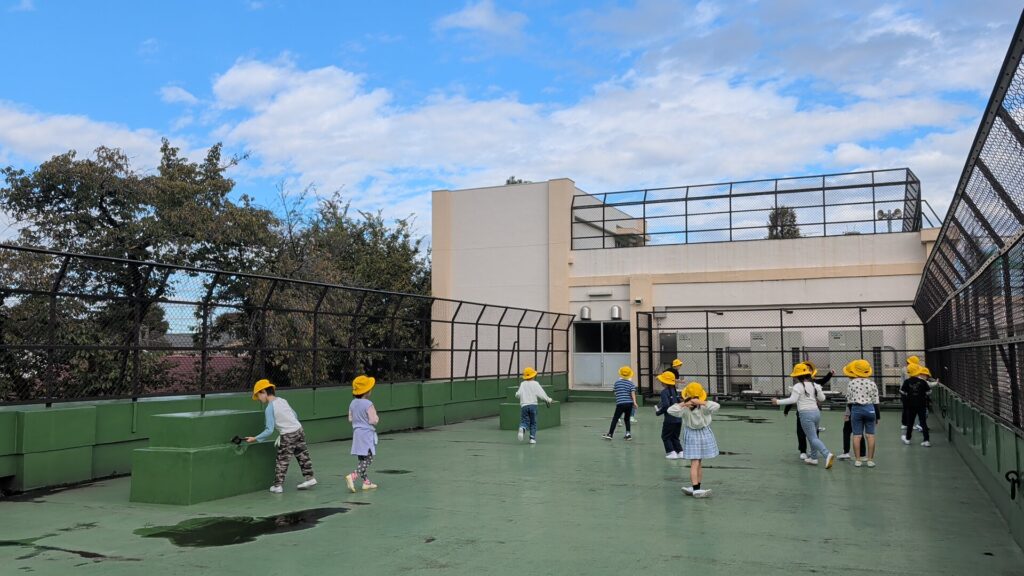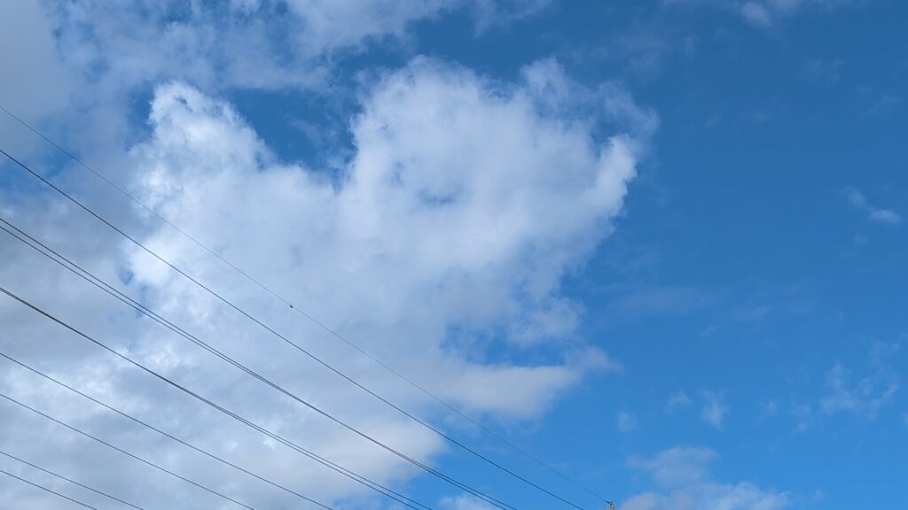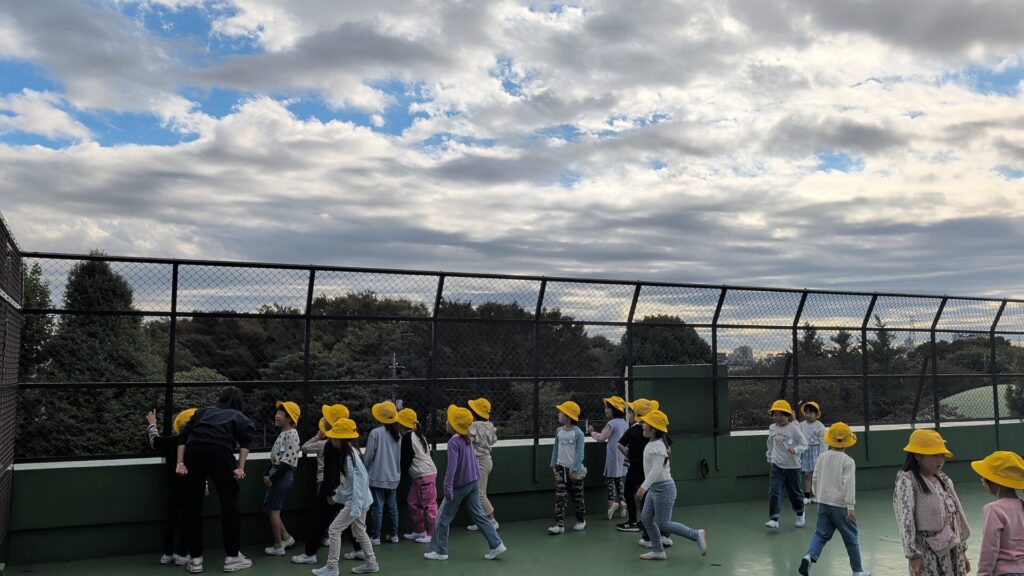 見上げた空には、いろいろな形の雲がゆっくりと流れています。「ティラノサウルスに見える!」「エビフライだ!」「ハート❤」など、子どもたちは想像をふくらませながら、思い思いの雲を見つけていました。