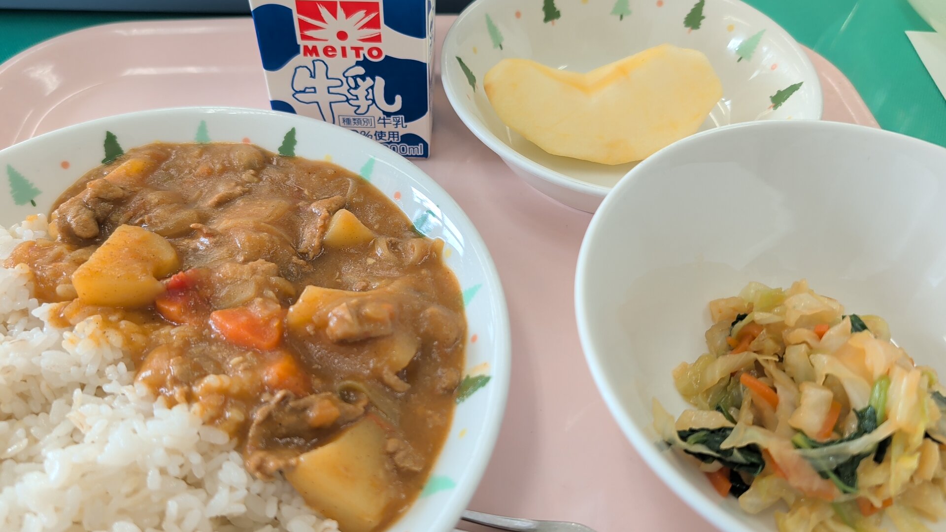 今日の給食は、カレーライス、野菜のレモン酢和え、りんご、牛乳でした。