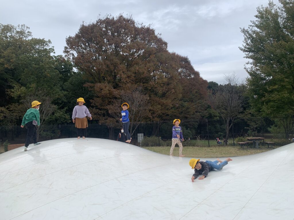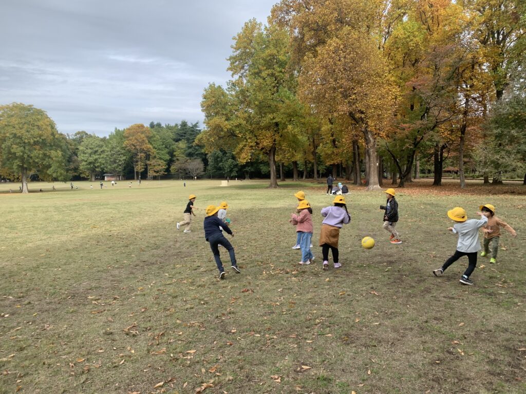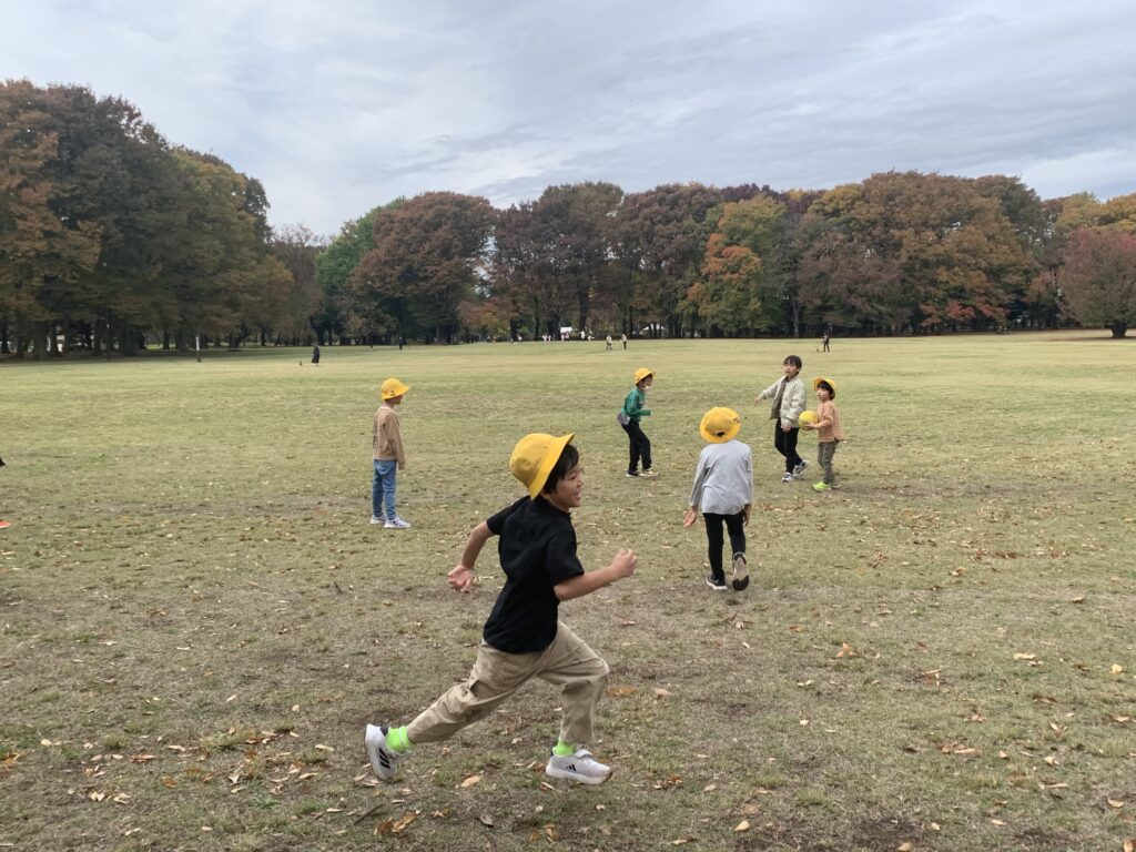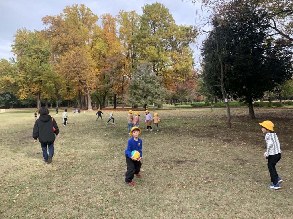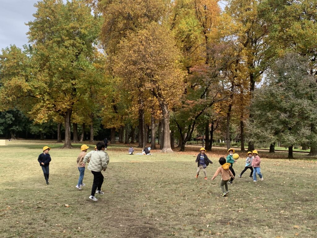 紅葉が始まった木々の美しさに「きれいだねー」と声をあげていたのも束の間、広い公園の中で思いきり体を動かして遊びました。