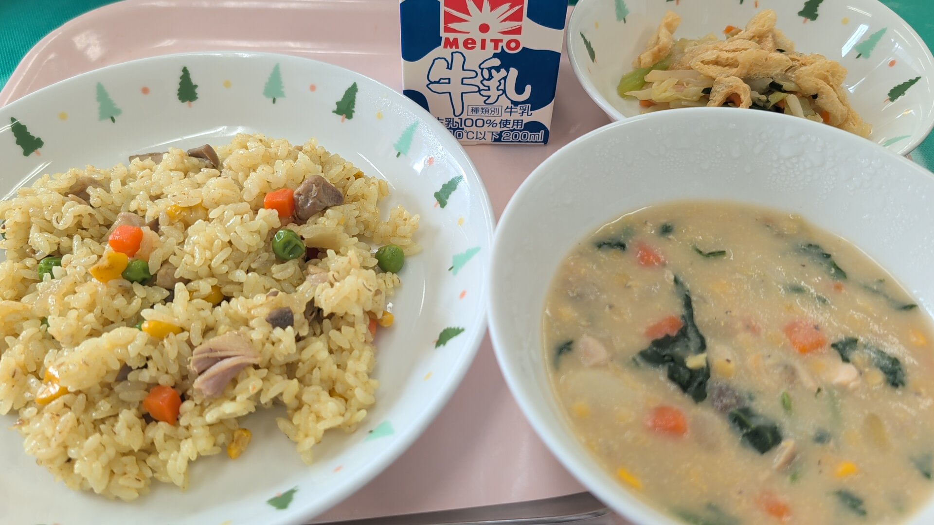 今日の給食は、メキシカンライス・コーンチャウダー・カリカリあぶらあげのサラダ・牛乳でした。
