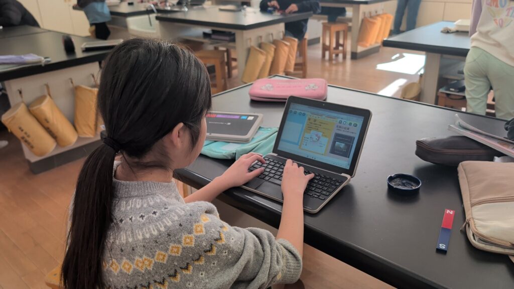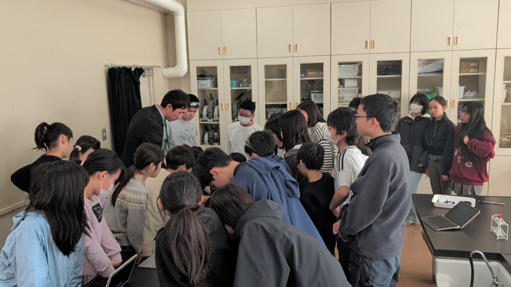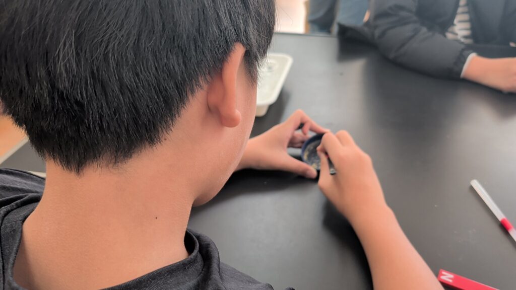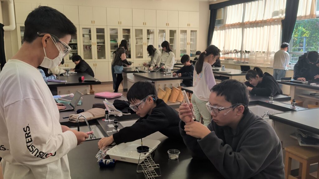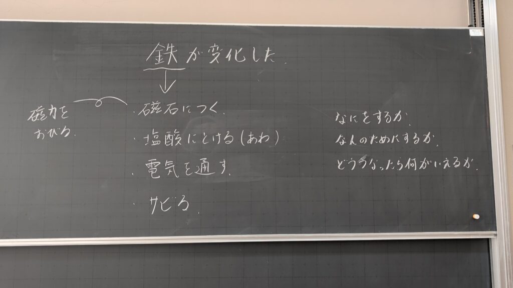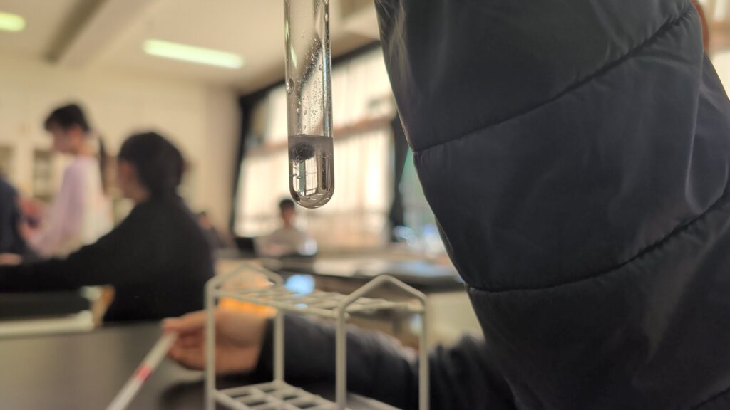 試験管の中で鉄が少しずつ変化していく様子を見つめたり、出てきた固体を磁石に近づけてみたりと、教室には本気の空気が漂っていました。