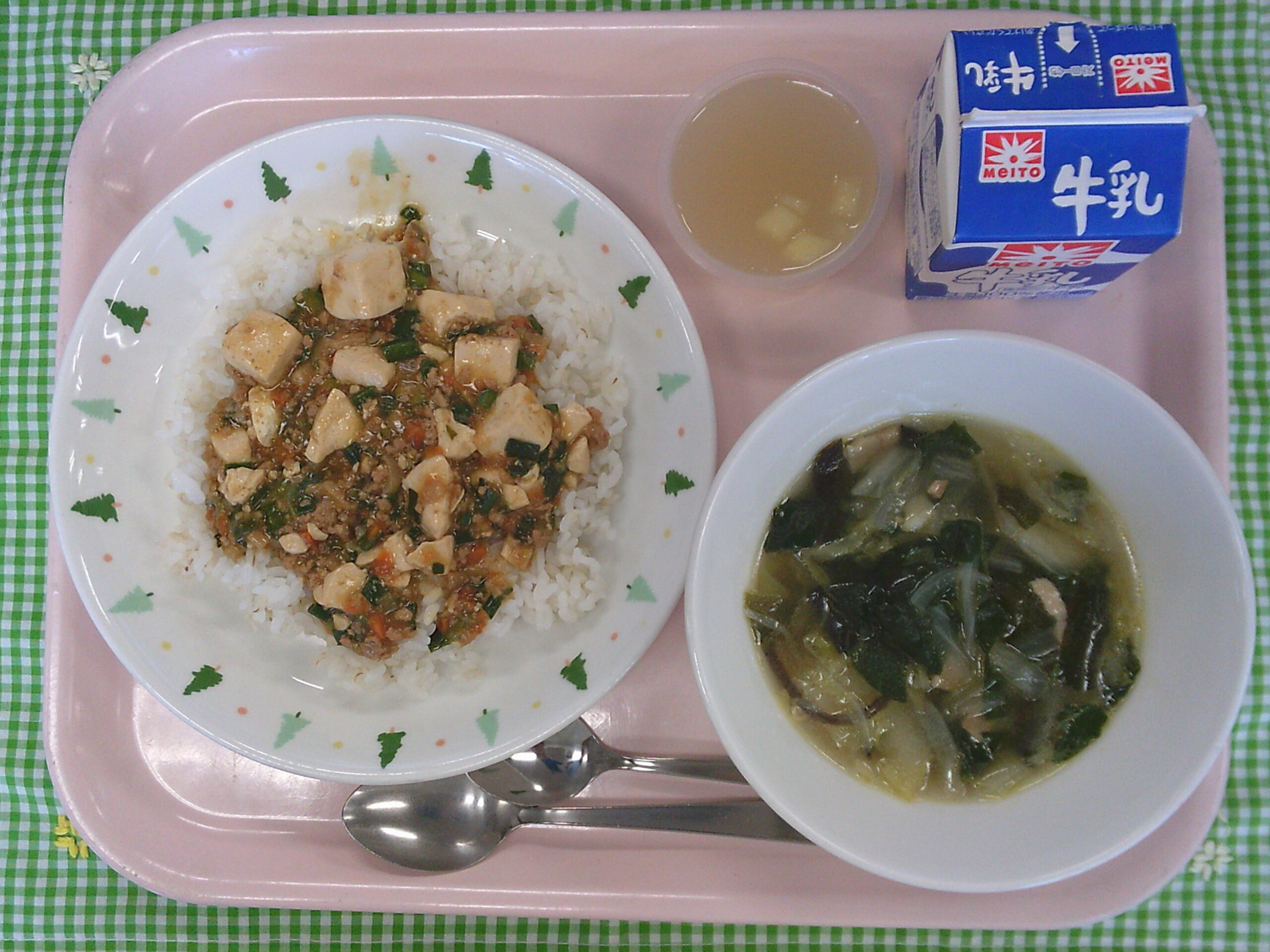マーボーライス、はくさいスープ、果肉入りりんごゼリー、牛乳