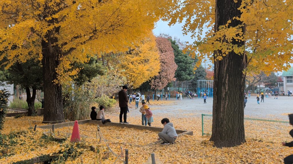 学校全体校庭の大イチョウが今年も見事に色づき、休み時間になると子どもたちはまっ先に木の下へ。