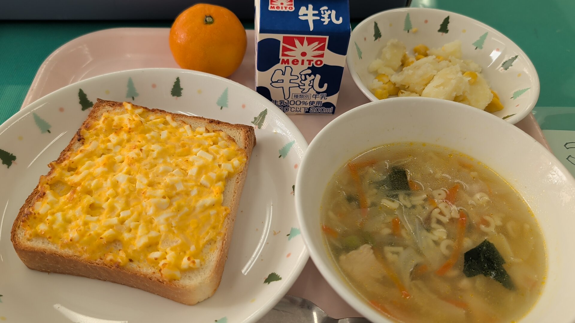 たまごトースト、ABCスープ、コーンポテト、牛乳、みかん