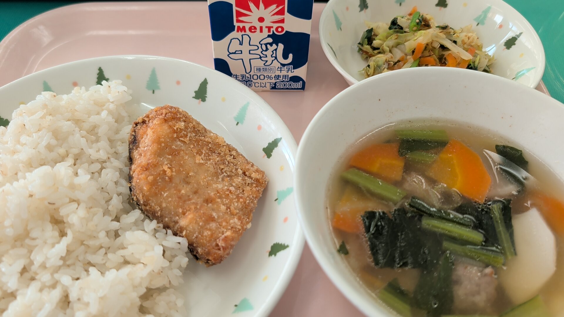 今日の給食は、麦御飯、鯖の竜田揚げ、蓮根団子汁、キャベツのおかか和え、牛乳でした。