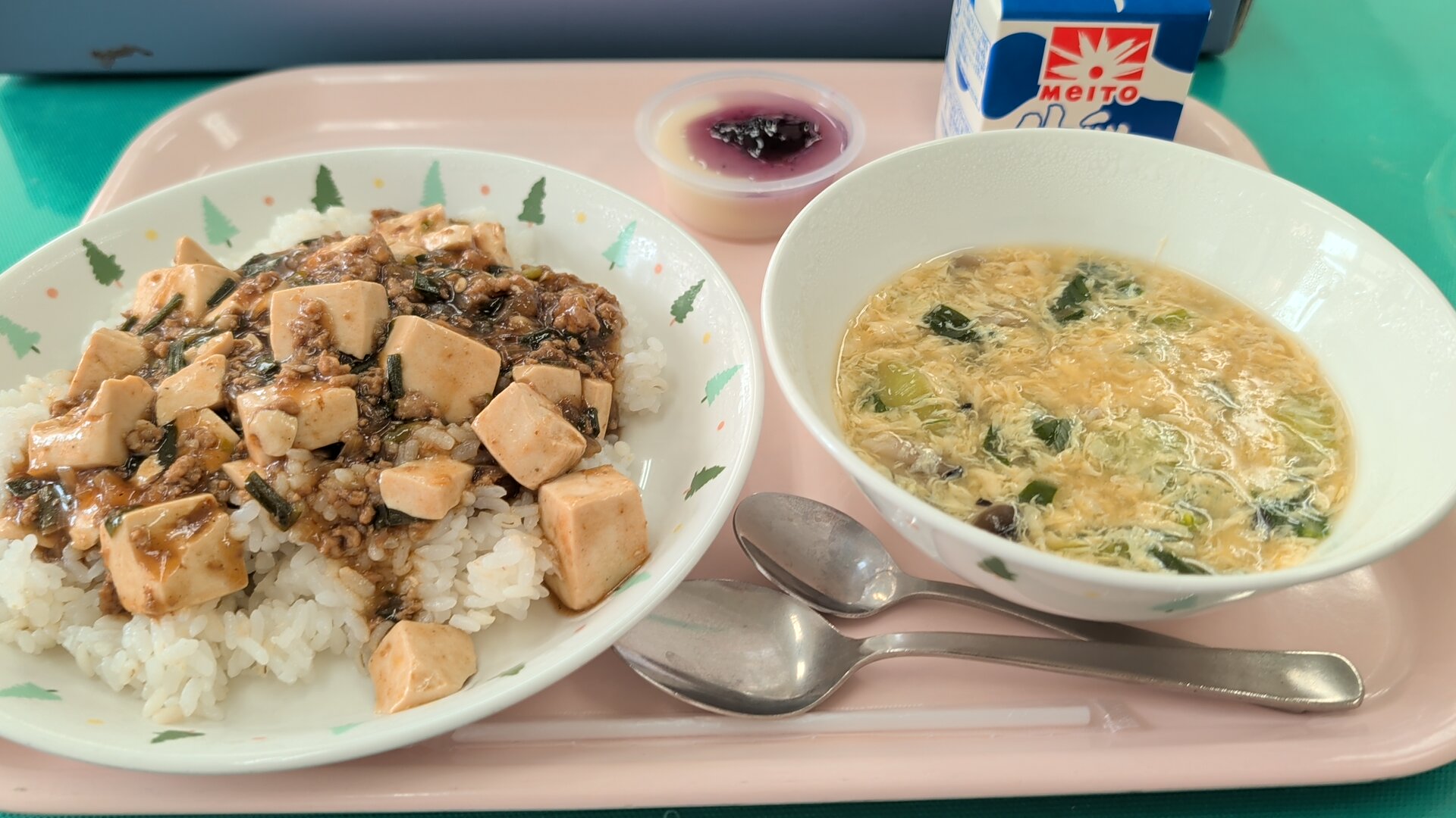 今日は、ご飯にたっぷりとかけた四川豆腐ライスが主役の献立でした。豆腐は口当たりがよく、ひき肉や香味野菜のうま味が合わさって、ご飯が進む一皿です。辛味は控えめで、低学年でも食べやすい仕上がりになっています。