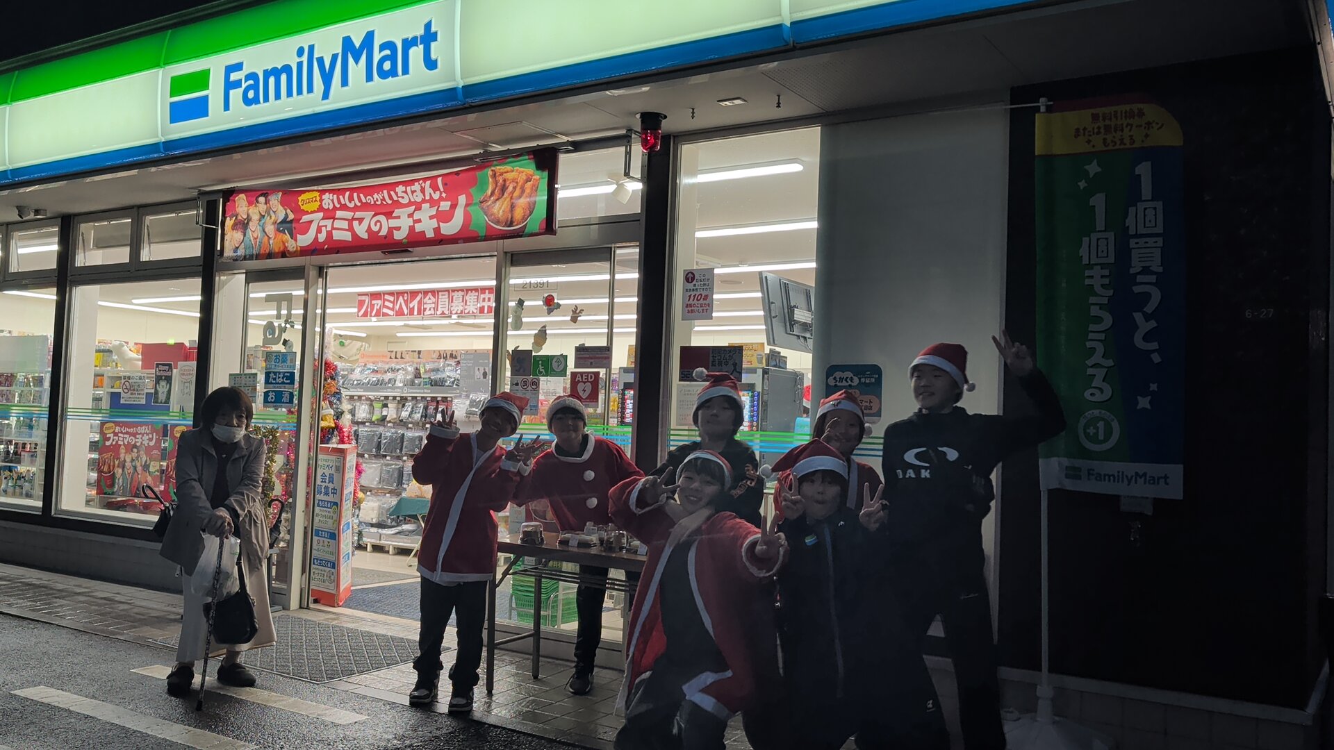 サンタの帽子に赤い衣装。ファミリーマートの前で、元気いっぱいに声をかけているサンタさんたちです。