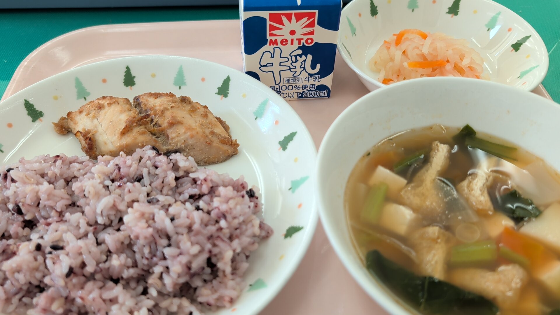 古代米ご飯、鰆の香味焼き、けんちん汁、紅白なます、牛乳
