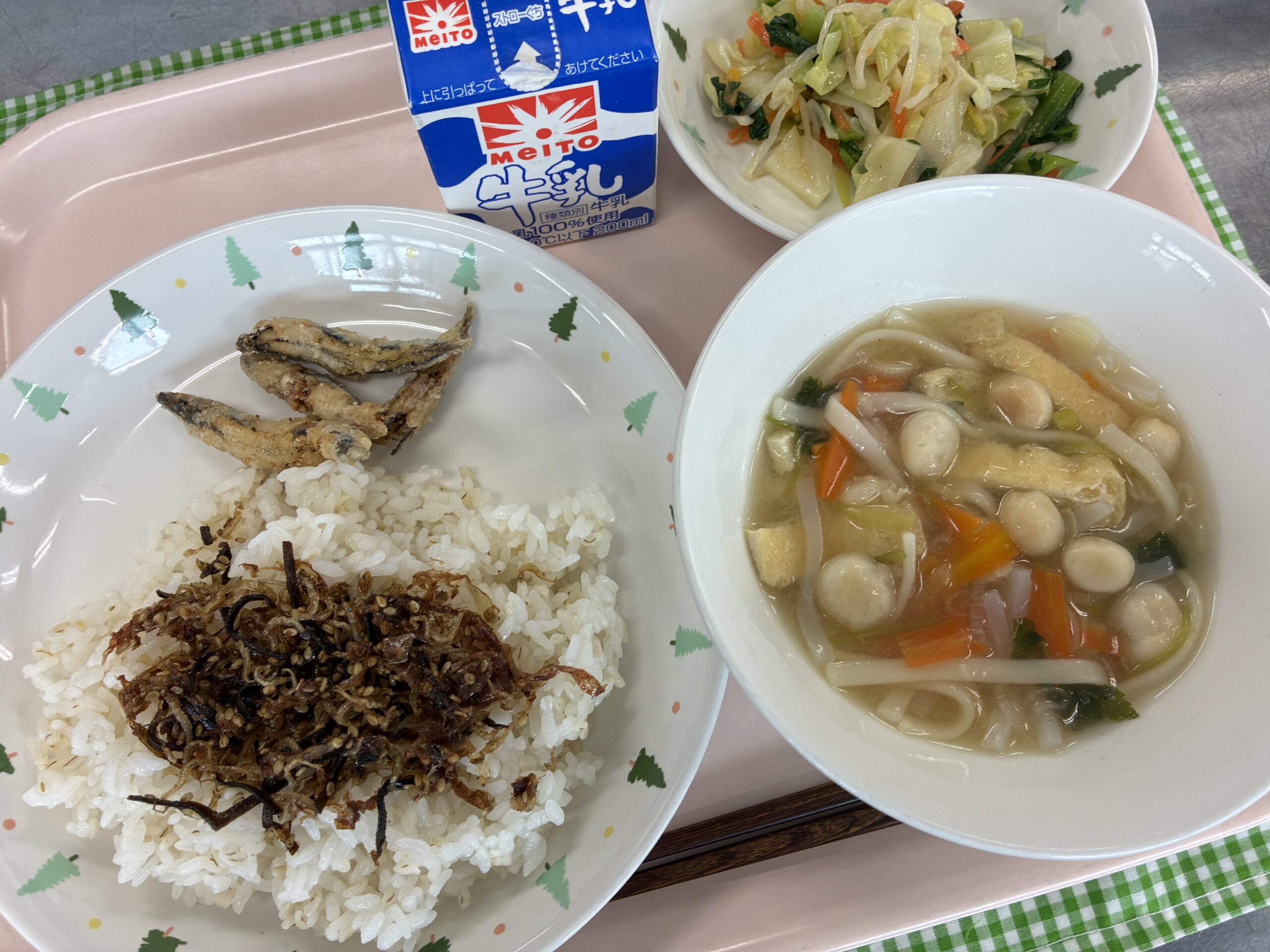 麦ごはん、かみかみふりかけ、きびなごの唐揚げ、吉野汁、茹で野菜の味噌ドレッシング、牛乳