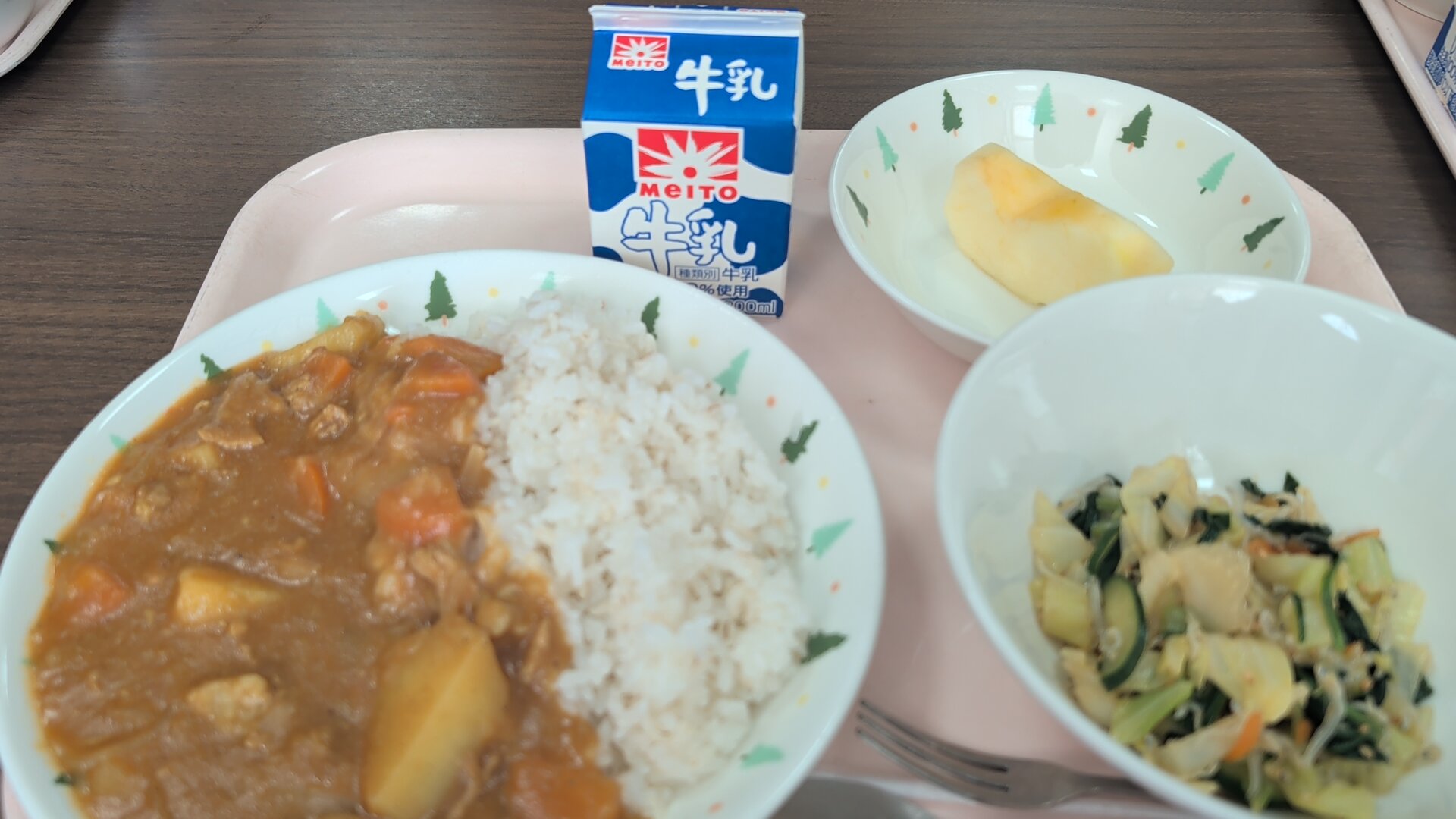 麦入りごはんに、じゃがいもやニンジン、肉が入ったカレーは、給食ならではの親しみのある味わいで、子どもたちにも大人気でした。