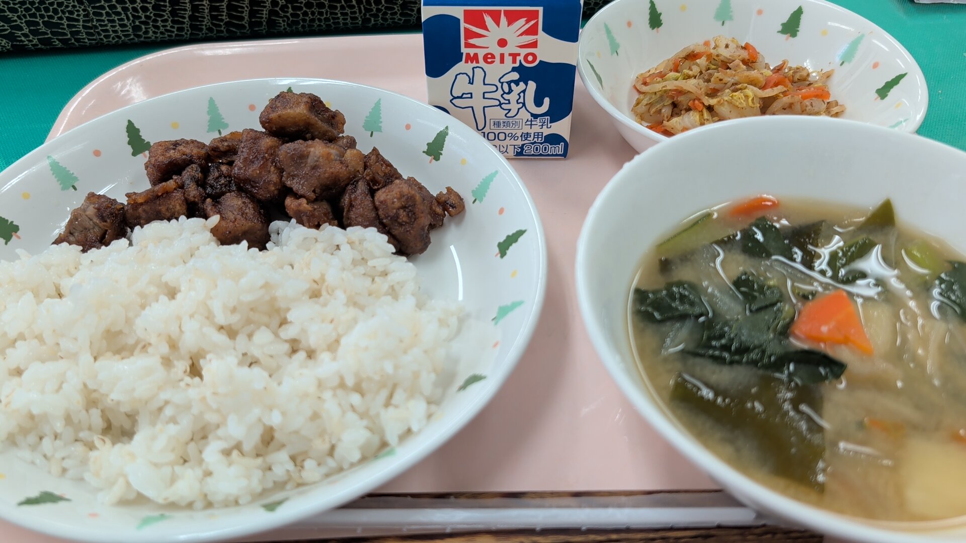 麦ごはん、くじらの竜田揚げ、野菜の味噌和え、白菜とわかめの味噌汁、牛乳