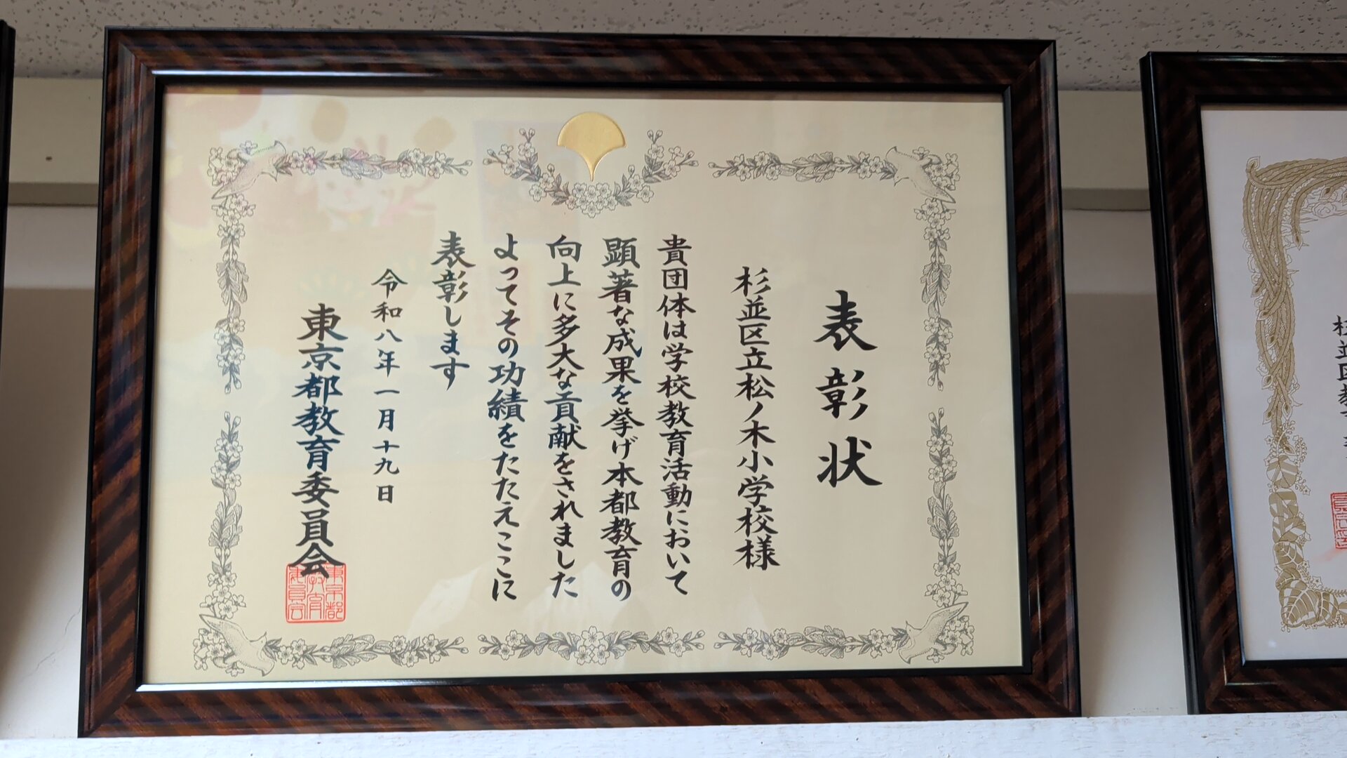 その取組が認められて、杉並区教育委員会と東京都教育委員会から、松ノ木小学校に表彰状が贈られました。