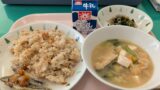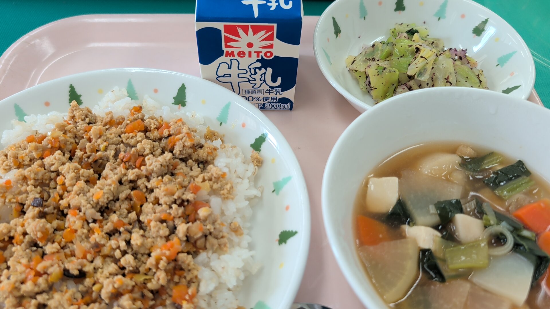 今日の給食は、高野豆腐のそぼろ御飯、のっぺい汁、キャベツとカブのゆかり和え、牛乳でした。