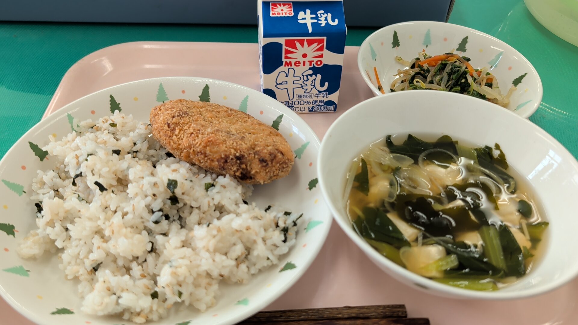 わかめの香りが広がるご飯に、外はさくっと中はほくほくのコロッケ。だしのうま味が生きたすまし汁と、彩り豊かな野菜の和え物が並び、和の味わいを大切にした献立となりました。