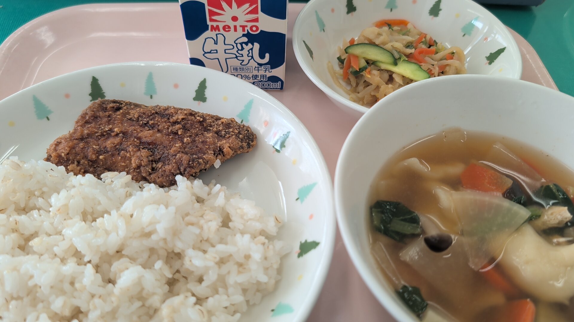 麦ご飯、サメの竜田揚げ、すいとん、シャキシャキあえ、牛乳