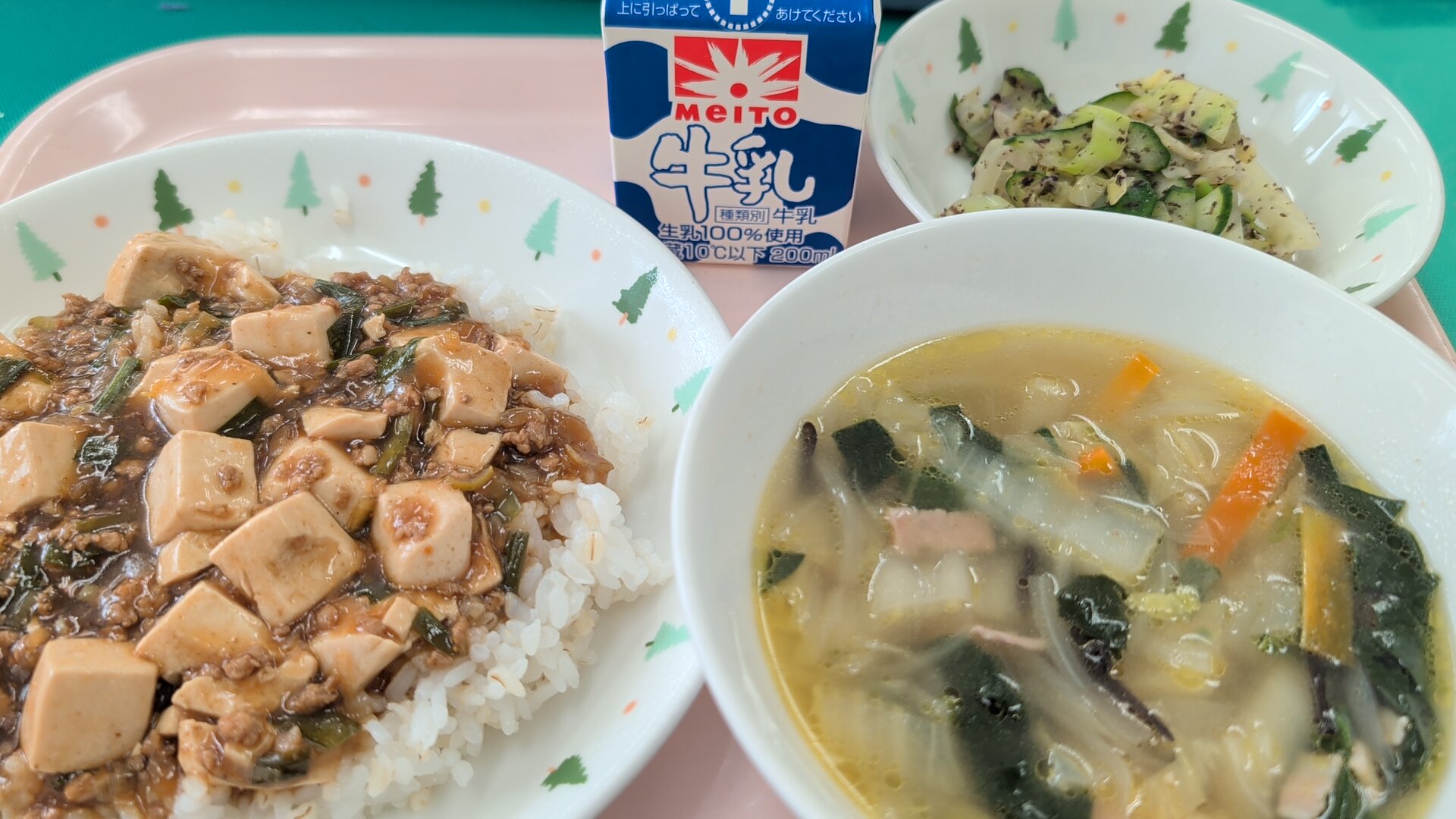 四川豆腐ライス、白菜スープ、キャベツときゅうりのゆかり和え、牛乳
