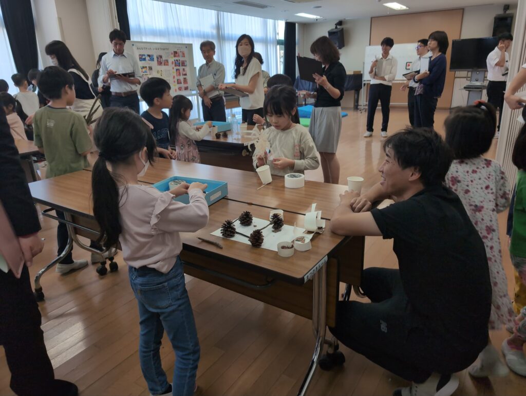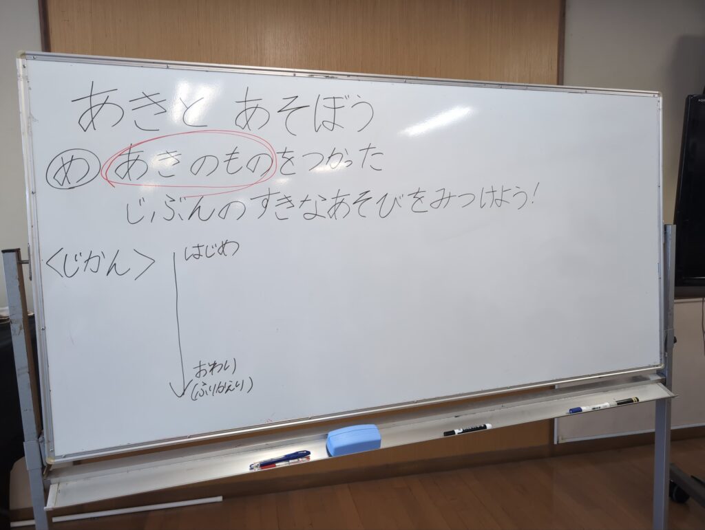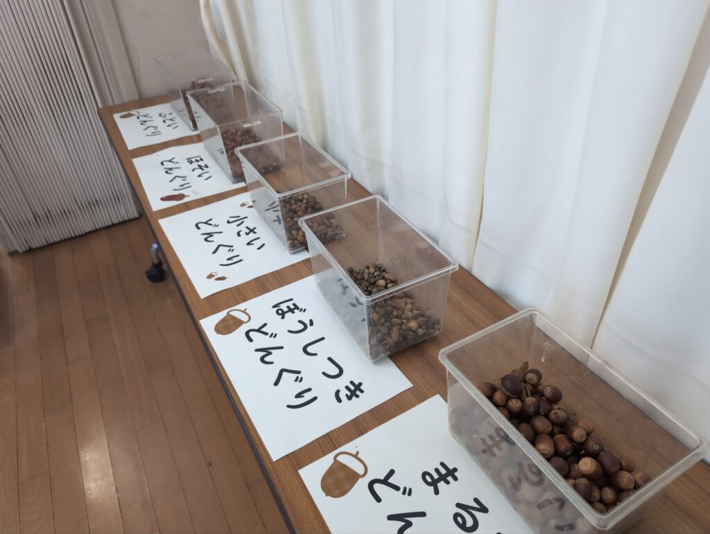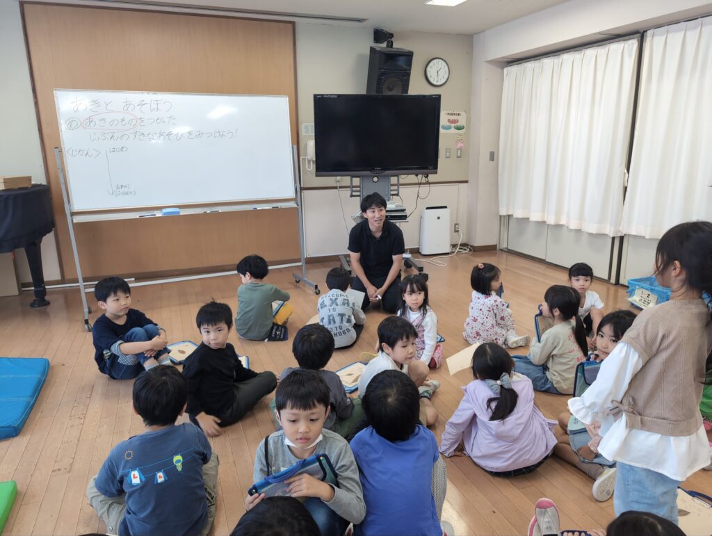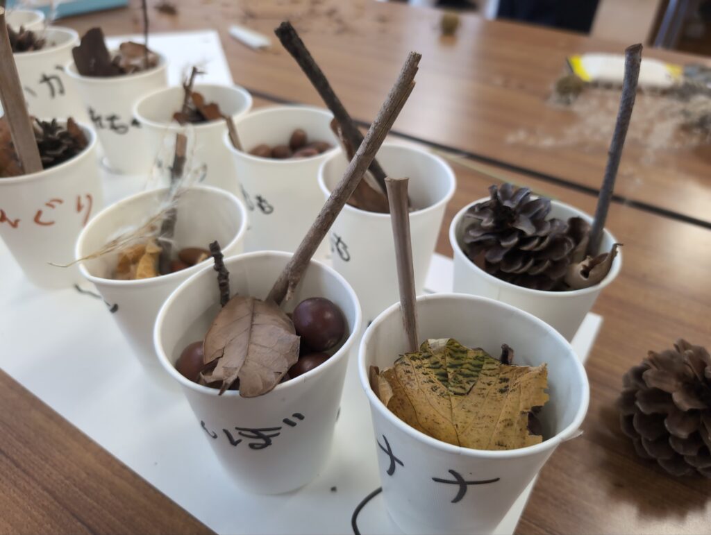 目標としては、秋の自然と関わる活動を通して、秋の特徴を見つけたり、自然を工夫して作品を作ったり、自然の変化に気付いたり、自分たちの生活を楽しくしようとしたりできるか、研究しました。