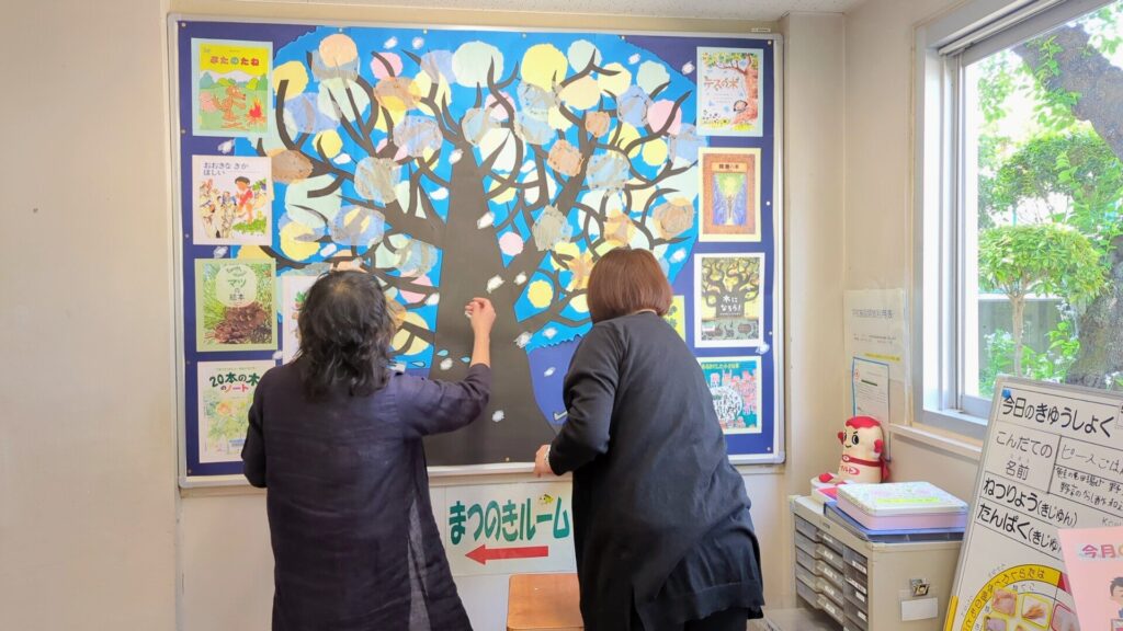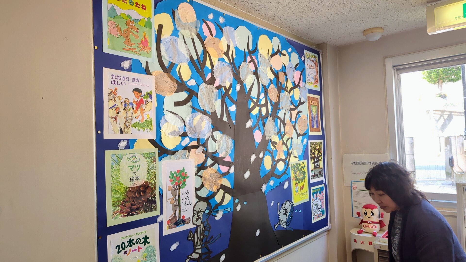 学校全体本校の玄関横には、本を紹介してくれる大きな壁面があります。この壁面には、毎月、図書館司書の先生が紹介したい本を見繕ってくださり、図書ボランティアの方々がその本の表紙を用いて壁面デザインを考えてくださいます。この取組は2015年から続いているそうです!