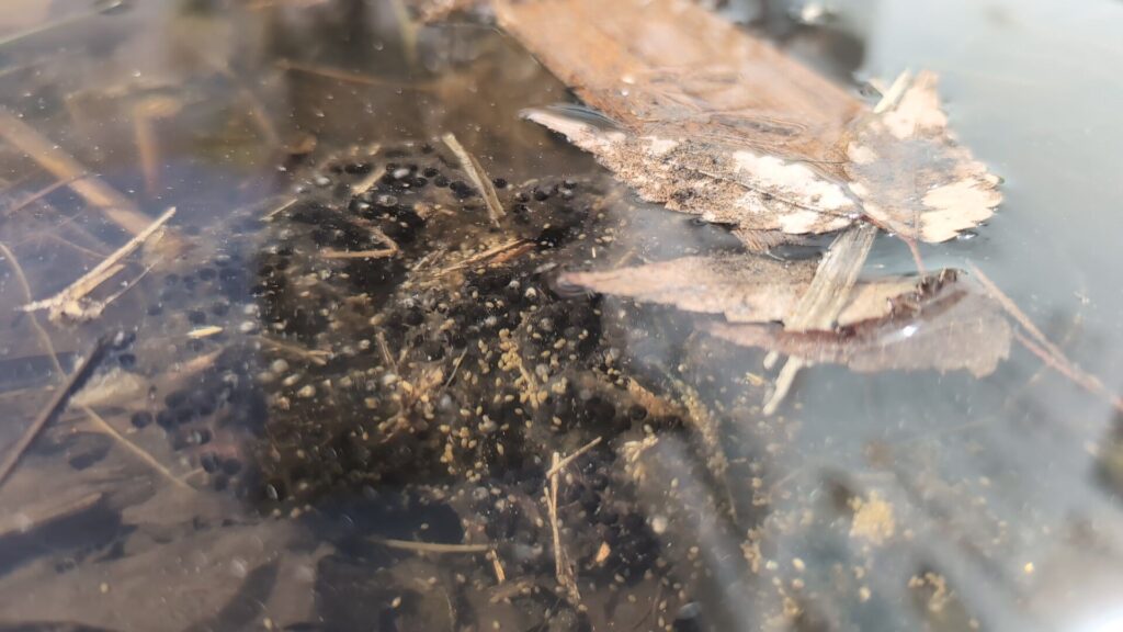 ヒキガエルは池の中で産みたかったのだろうけど、ネットが邪魔して入れなかったんだと思う。