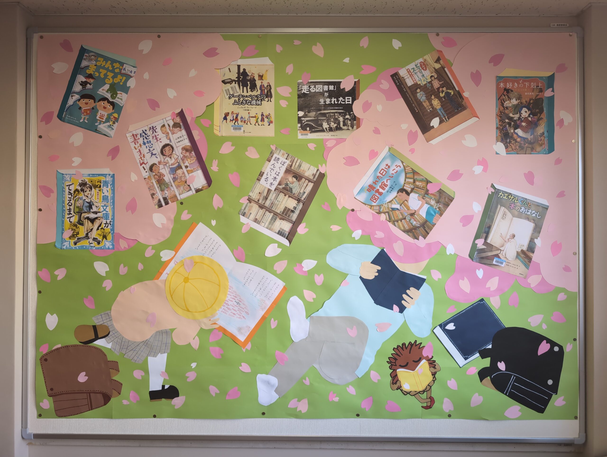 3・4月の本の紹介の壁絵のテーマは「本」です。
