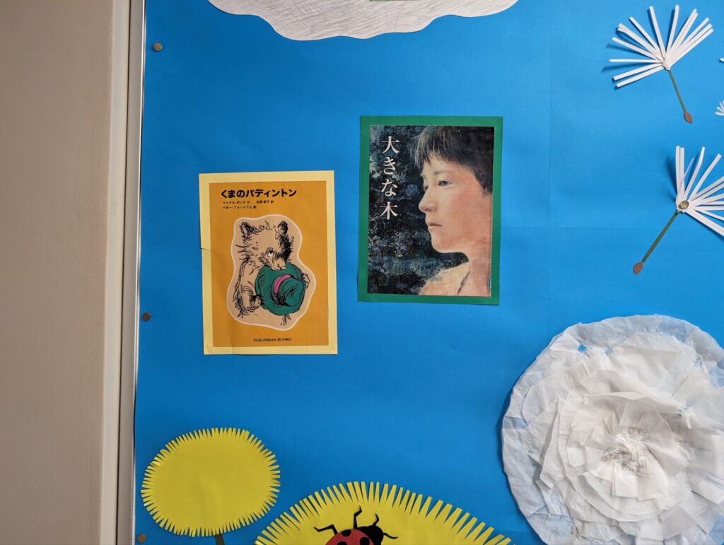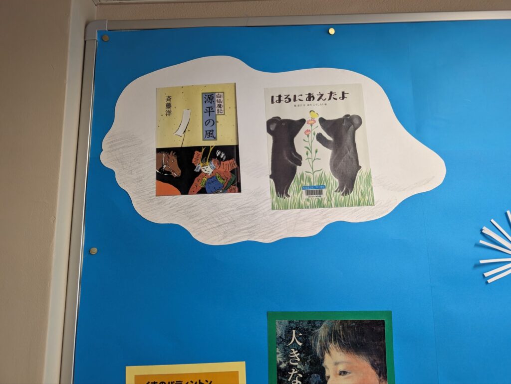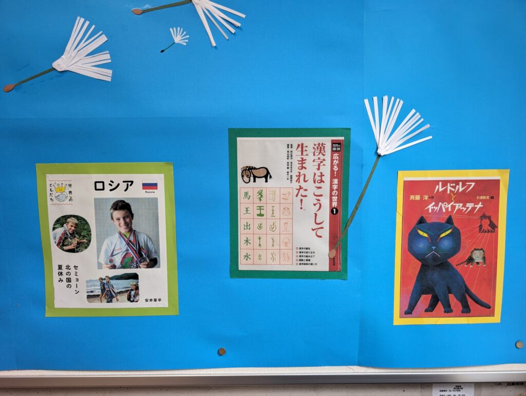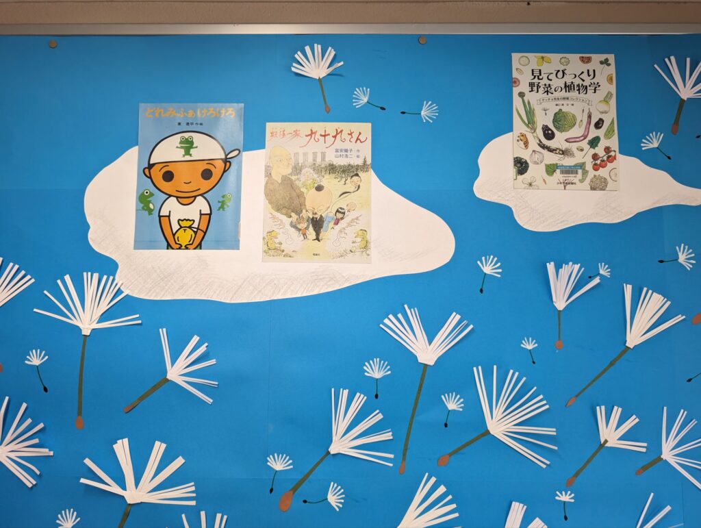 学校全体素敵な青空と綿毛が舞っている背景に、5月の本の紹介がありました。