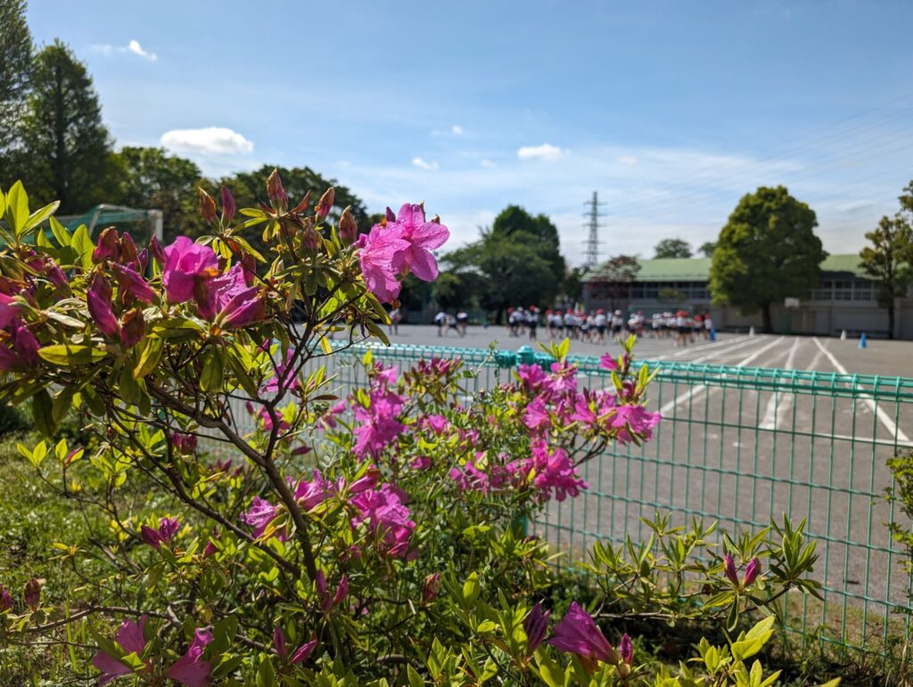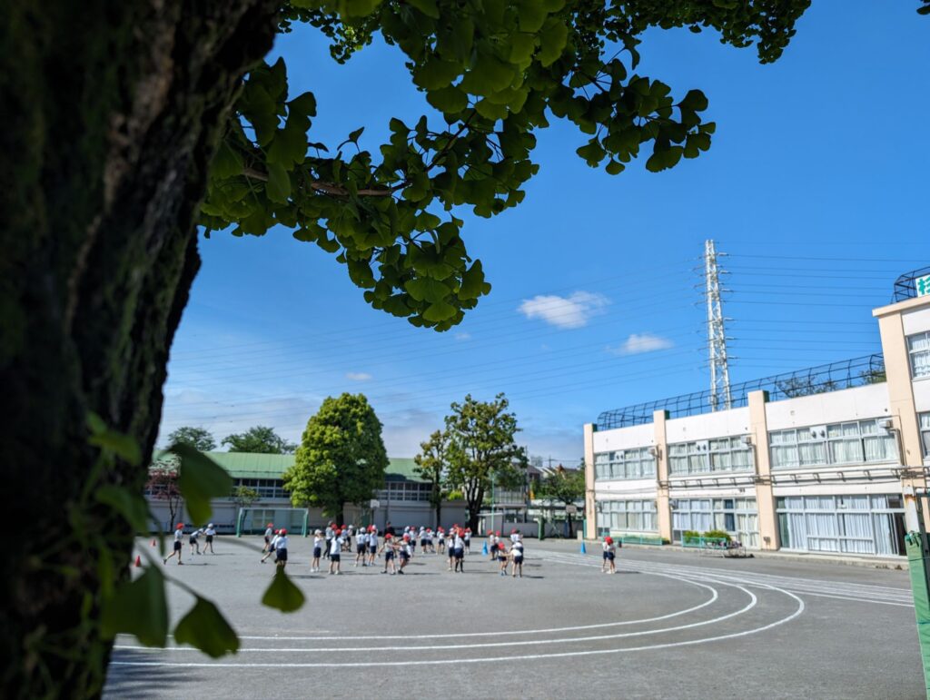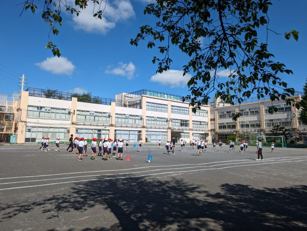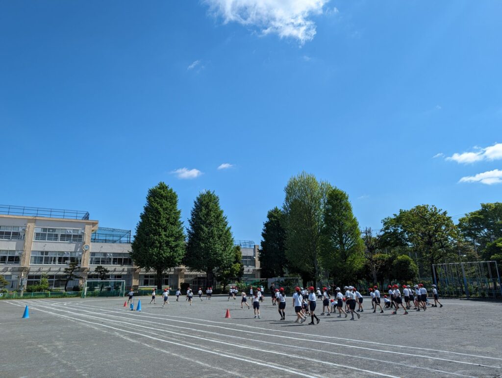 校庭では久しぶりの晴れで、子供たちが元気に体育をしています。
