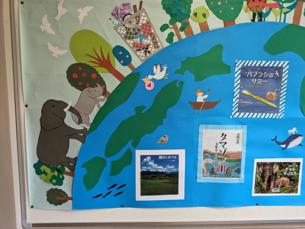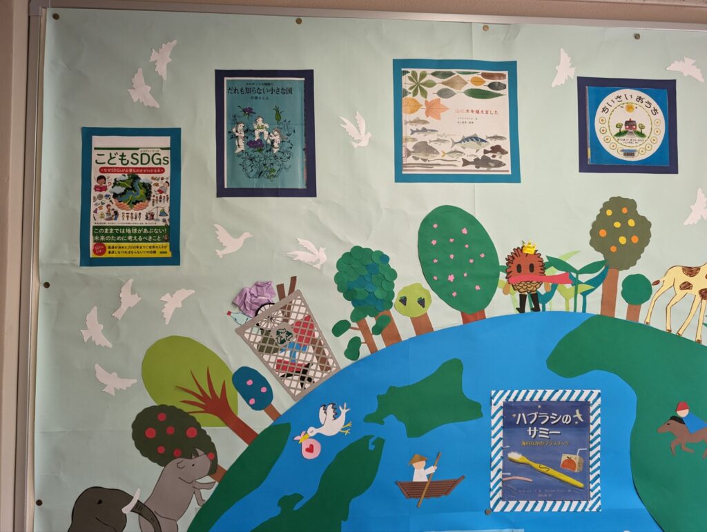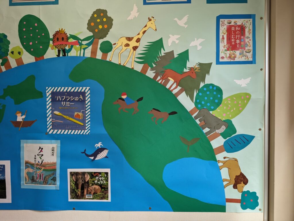 学校全体図書ボランティアの皆様には1か月に1度おすすめの本を壁面に紹介していただいております。