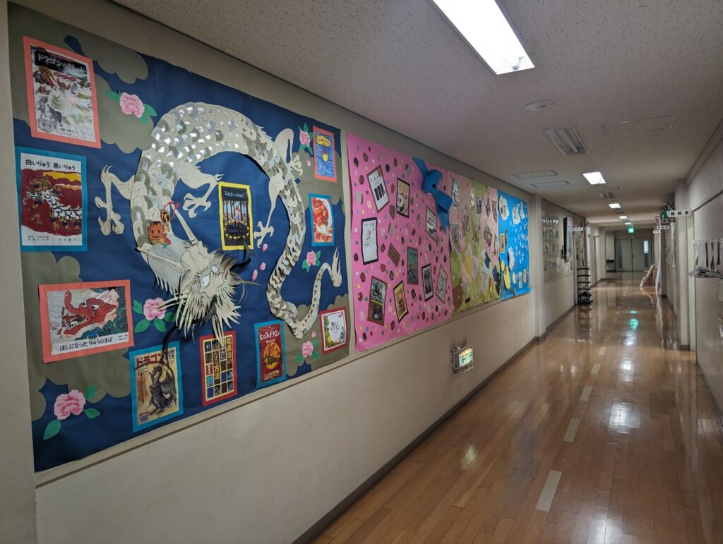 職員室前の廊下には4ヶ月分の壁面も掲示してあります。