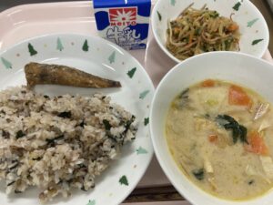 今日の給食は、ハロウィンにぴったりのメニューでした。 チキンドリア、ABCスープ、かぼちゃプリン、牛乳です。 … 続きを読む: ハロウィン給食 - 献立表(11月号)