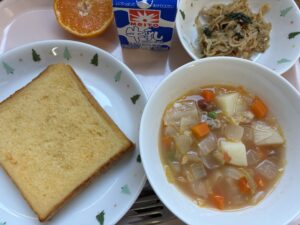 フレンチトースト、ミネストローネ、きりぼしだいこんのサラダ、牛乳、きっかみかん 今日の給食は、香ばしく焼き上げ… 続きを読む: しみしみフレンチトースト - チキンチキンごぼう