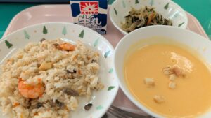 シーフードピラフ、ポタージュ、なんでもせんぎりサラダ、牛乳 今日の給食は、プリッとしたエビややわらかなイカが入… 続きを読む: ポタージュとシーフードピラフ - 献立表(12月号)