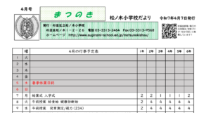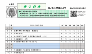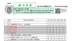 さわやかな風に新緑が映える5月。松ノ木小学校では、スポーツフェスティバルの練習や、校外学習、学年ごとの学習活動… 続きを読む: 学校だより(5月号) - 献立表等(5月号)