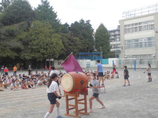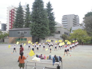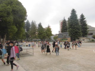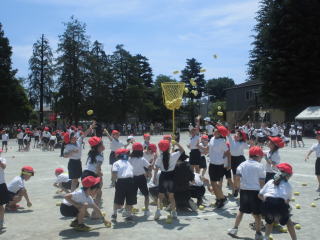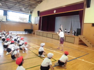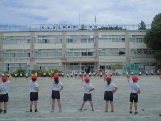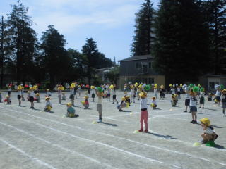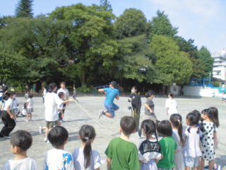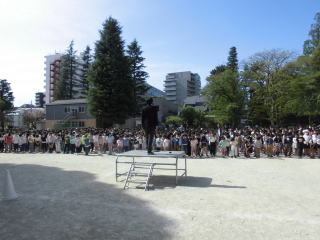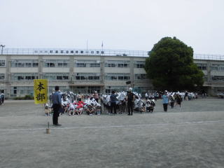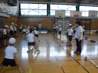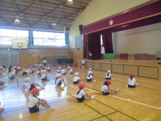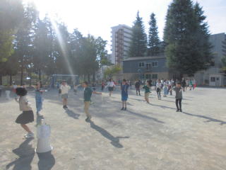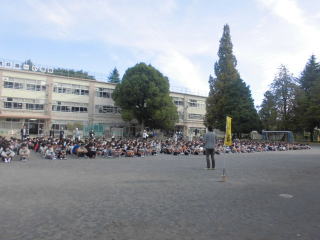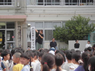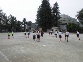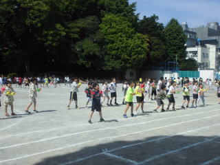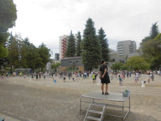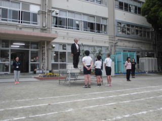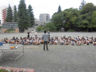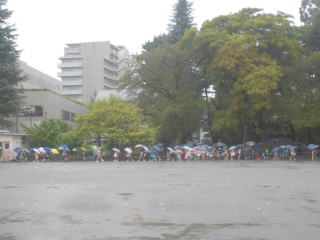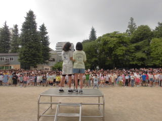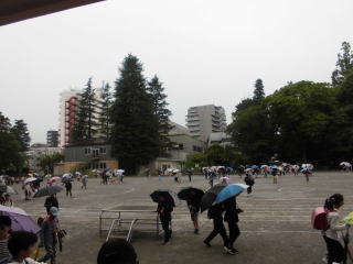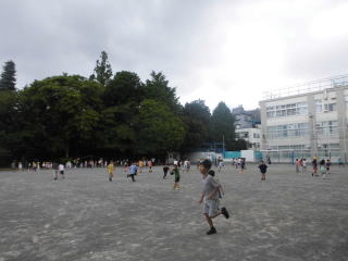 このところ月曜日はいつも雨。今朝も全校朝会は体育館で行いました。徐々に雨が上がり、外での活動もできました。