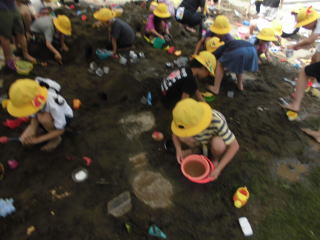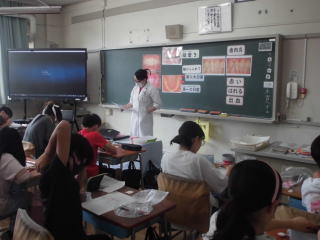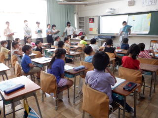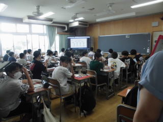 今日もまた暑く、校庭での活動は難しかったです。6年生は口腔保健指導がありました。1年生の砂遊びは、テントを立ててやりました。水泳は、たまたま日がかげって、風もあり暑さ指数が下がったので、実施することができました。午後は校内研究授業。6年1組で社会の研究授業を行いました。