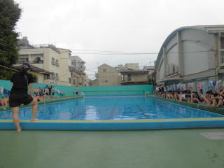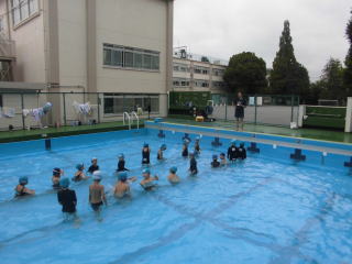 今朝は体育館で図書委員会の集会がありました。4年生が理科でペットボトルロケットをやっていましたね。1年1組2組が2回目のプールでした。