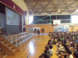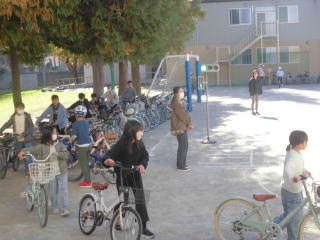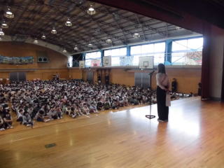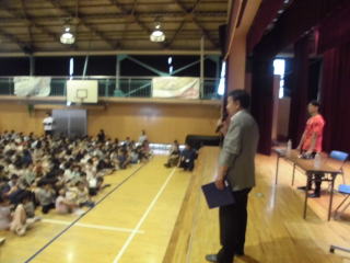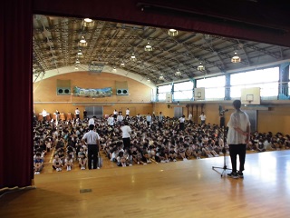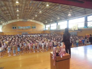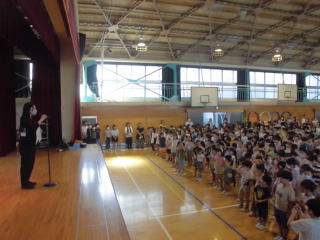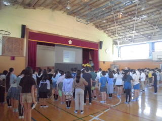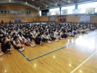 4年生が自転車安全教室を予定していましたが、残念ながら、また雨でした。延期日については、これからまた調整です。体育館で全校朝会をしました。