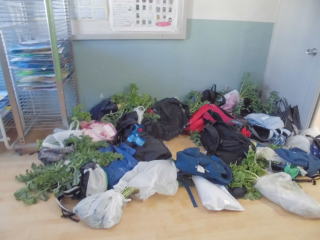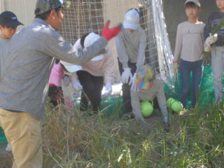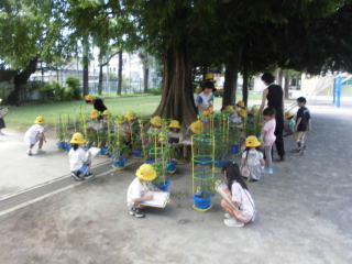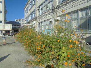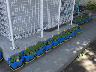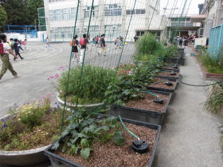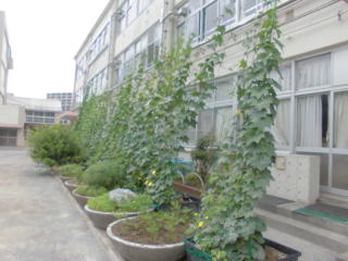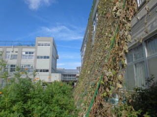 いい天気になりました。壁面緑化の植物も順調に育っています。校庭での体育も、元気に活動をしていました。今日は2年生がセーフティ教室でした。