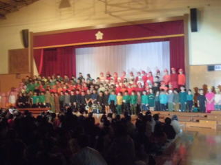 今朝は体育館で音楽朝会でした。校歌を歌いました。冒頭の「明らけく治まるみ代の八とせ春」という中に、開校の年の「明治八年」というワードが入っています。歴史ある桃一小の校歌です。