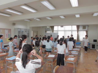 今日も暑い日となりました。朝のからだ力タイムは中止。早朝合唱の練習、4年生の読み聞かせが朝ありました。1年生の原っぱ公園への校外学習は、朝の早いうちに短時間で行いました。お手伝いいただいた保護者の皆様、ありがとうございました。