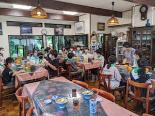白樺湖移動教室1日目。鷹山ファミリー牧場で飯盒炊さん。雨の中、宿舎へ移動。白樺湖は霧の中でした。けっこう、肌寒いです。