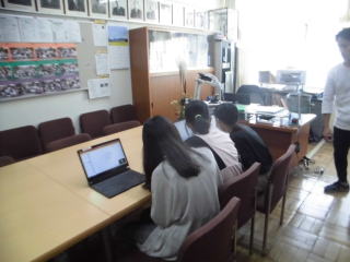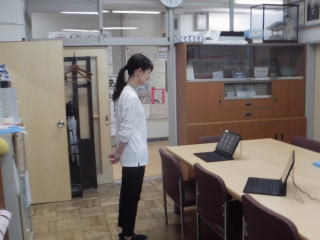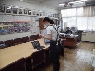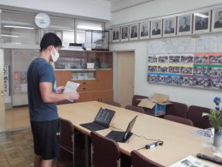 今日の全校朝会もTeamsを使って、オンラインでの全校朝会です。看護当番の先生からの話も画面を通して、行います。今日はフリップを使って行っていました。