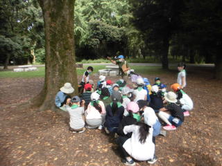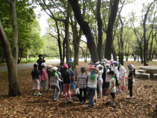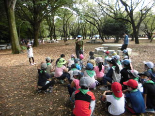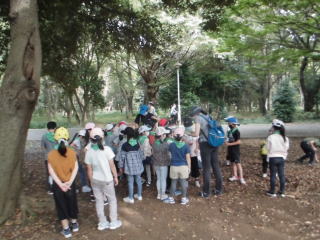 2年生の生活科見学。バスで光が丘公園に行きました。ネイチャーゲームを行って、お弁当を食べて、遊具で遊んで戻ってきました。