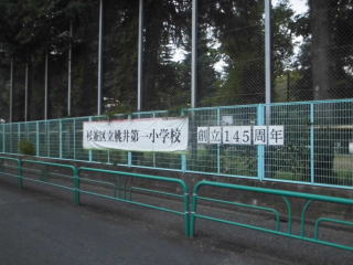 桃一小は今年創立145周年。新型コロナウィルスの影響で、記念の集会もイベントもできない状態ですが、少しずつアピールをしていこう、ということで校庭外のフェンスに表示をしました。学校の歴史と伝統を大切にしていきたいと思います。