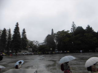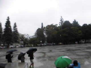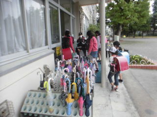 おかしくない天気です。みんな、傘を持って登校してきました。