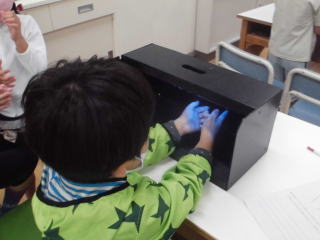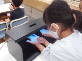 今日の1時間目、1年1組が手洗いの学習をしました。これはからだ力の一つ、基本的な生活習慣として学習しています。手洗いの後、蛍光剤をつけて、ブラックライトで照らすと汚れの残っているところが白く浮き上がります。この学習を通して、正しく手洗いできる力をつけてほしいと思います。これも「からだ力」です。